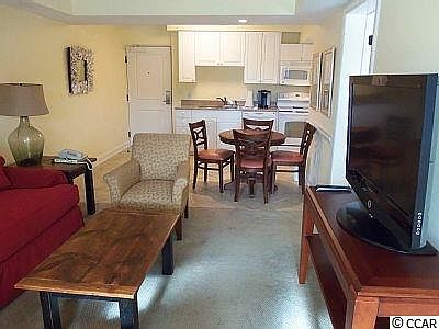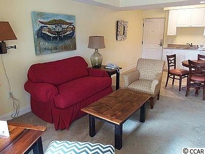 Great rental property or vacation retreat. Immaculate one bedroom, one bath condo with living room, dining area and full kitchen. Conveniently located on first floor above parking level, this is an end unit with balcony overlooking the pool and lazy river. Completely furnished and updated with attractive furnishings. Two queen beds, new sofa bed in living room, two large screen TV's, recycled wood coffee and end tables, original oil painting over sofa and decorative oyster shell mirror. New carpeting in 2013 and new HVAC installed in July, 2015. Unit is conveniently located to elevator and building laundry room. Amenities include large outdoor pool with lazy river, hot tub/spa, private beachfront access with restrooms and large deck with ocian views, tennis, fishing, crabbing and kayak launching dock and biking/walking paths. Restaurant, coffee shop and spa are adjacent to the building. Walk to the beach or take the complimentary shuttle. Close to all area attractions, shopping, dining, golf and entertainment. Monthly HOA fee includes ALL electricity, internet access,telephone, cable, water and sewer.