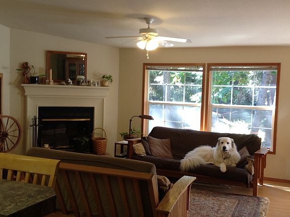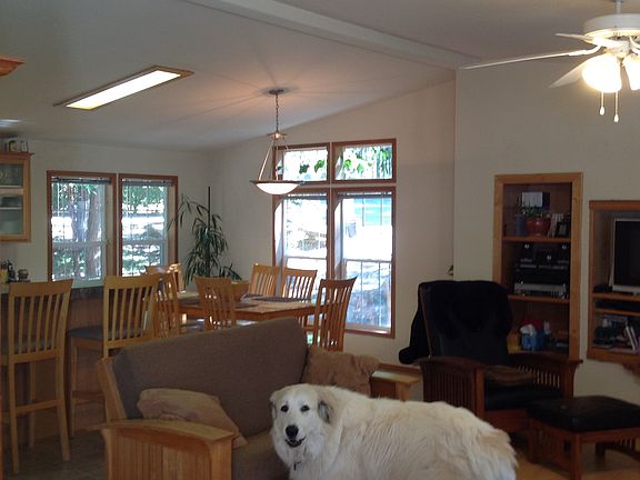 Open floor plan -greatroom features raised hearth fireplace1795 Square Feet2 Bedroom, 2 BathsNice size office2x6 wall construction with extra insulation for energy efficiencyDual pane windowsFiber cement siding - fire resistanceModified eves for fire resistance30 lb snow load roof with a 6 and 12 pitch roof - not your typical flat roof mobileVaulted ceilings throughoutSitting room/ flex space in master suiteSpacious master bath with walk-in shower and garden tub and a TV!Double sinks in both bathrooms and extra linen cabinetsOpen concept kitchen features:Kitchenaid dishwasher with stainless steel tubBuilt in GE microwaveNew garbage disposal in upgraded cast iron sinkFreezer space in large utility/ mud roomWood stove permitted and professionally installed:Custom raised travertine stone hearthEnergy efficient EPA IICentrally located to heat the whole house - takes 20" logsCentral HVACGreat location end of cul-de-sac lot-- wonderful neighborsGreenbelt lot --miles of trails to explore right out your door!Walking distance to POA pool, tennis courts, and rec room5 min walk to the regional bus stopCounty maintained roads - plowed in the winterFully landscaped water wise, low maintenance, and pet friendly- automated drip systemDeck with a view of green belt Work shop