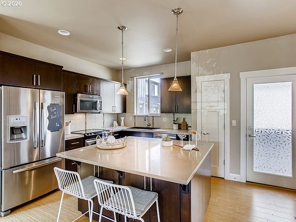 Modern, contemporary, bright and well maintained. Just steps to hi-tech, Nike, shopping, movies, restaurants, MAX, close to hwy 26. Home boasts tall ceilings, open floor plan w/huge slab granite island, modern flameless fp, new carpet, designer paint + many more upgraded features. 4th bed/Den/Bonus on the ground floor. HOA covers landscaping & club house with party room, seasonal pool & gym. Miles of nearby trails ideal for walking and biking.