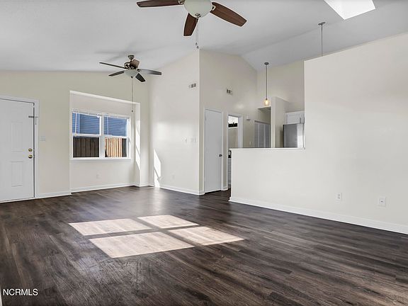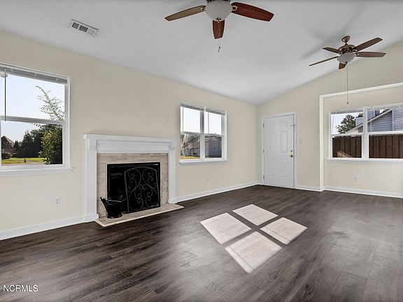 Discover the latest addition to the Havelock, NC market: a charming townhome nestled in the Smallwood's-Hunters Landing subdivision. This contemporary home boasts two bedrooms and one full bathroom. Step into a welcoming open living area with vaulted ceilings and a cozy fireplace for chilly winter nights. The kitchen, featuring a counter serving bar, is designed with a tiled backsplash and stainless-steel appliances. Enjoy the ease of laminate flooring throughout, except for the tiled bathroom, which includes a single vanity with a granite countertop. The primary bedroom offers a sliding glass door that opens to a back patio, providing access to the backyard and additional storage. The second bedroom features a pull-down attic access. A laundry area is conveniently located in the hallway. The side main entrance leads to an open patio, enclosed with a fence for private enjoyment and guest entertainment. The front of the home has a paved parking area. Recently painted interior and ceiling fans add to the comfort of this home. Situated within city limits for quick access to USMC Air Station Cherry Point, dining, shopping, and local amenities. The seller is providing a $500 credit for a home warranty selected by the buyer. This property represents an excellent investment opportunity for those interested in purchasing rental real estate. Seller was receiving $950 a month for rental income. *Back of the house has some rotting fascia. Seller is working on this.