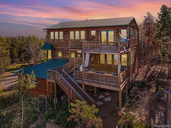 Colorado Mountain Home with fantastic Continental Divide Views. Open concept living on the main level is graced with impressive log posts and beams. Great room features a cozy wood burning stove and wet bar. Also on the main level are the dining area and updated gourmet kitchen with breakfast bar, gleaming new quartz countertops and newer appliances, including a wine refrigerator. All this opens to a wonderful deck where you will have fun entertaining and dining al fresco as you watch sunsets that will take your breath away. Many windows frame forested hillsides and majestic peaks of the Rocky Mountains. Work from home with high-speed fiber optic internet. Home has been freshly painted throughout. On the upper level you will find a full bath, two bedrooms, laundry area and primary bedroom suite with a five piece bath. Primary bedroom opens to a private deck, perfect for winding down under stars that seems touchable. Another bedroom and full bath on the lower level complete the living space in this fantastic home. The level lot has magnificent rock outcroppings and is fully fenced on a quiet cul-de-sac lane. Less than 30 minutes to Boulder or Golden and even Eldora Mtn Ski Resort. Nederland or Golden Gate Canyon State Park are each just 12 miles away. Come on up and live where you play in Colorado's "back yard"!