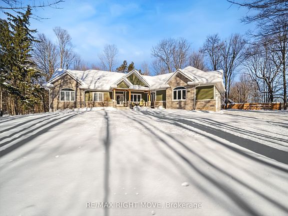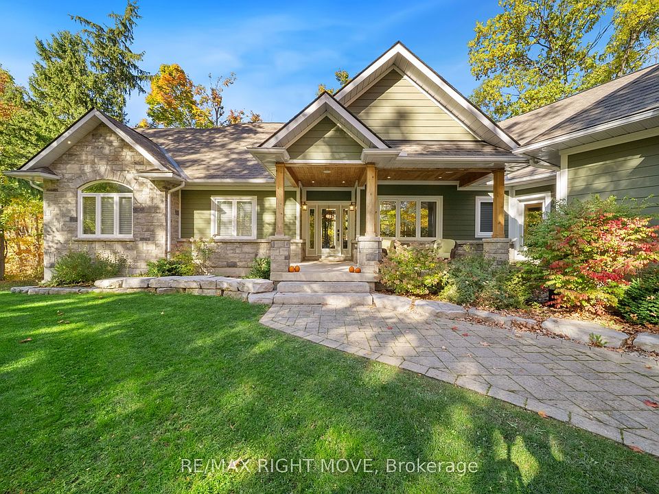 Welcome to your private getaway just 5 minutes from Orillia! This custom-built bungalow sits on a private 1-acre lot just a short walking distance to Bass Lake. The home has great curb appeal with stone and siding finishes, big gable peaks, and both an attached oversized 3-car garage and a detached 2-car garage with a loft above. Inside, you'll find an open, functional layout with a hidden room tucked behind the kitchen cupboards - perfect for a pantry or home office. The 3-season Muskoka room is the ideal spot for morning coffee and is totally privacy with no neighbours in sight. The detached garage has water and hydro, high ceilings, and an 800 sq ft loft that's great for storage or could be finished as an apartment. Downstairs, the fully finished lower level offers a bright in-law suite with two walkouts that make it feel like its own main floor. Thoughtful landscaping ties everything together, giving the whole property a warm, welcoming vibe.
