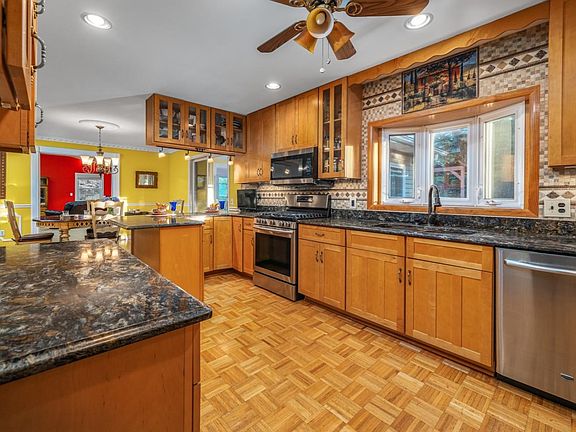 Located in a Top Rated School District, this one of a kind custom Bi-level nestled on a park-like open lot with a spacious deck, patio, pergola & more... Classic charm throughout offers a new kitchen with honey maple cabinets, glass front accents, ceramic tile backsplash and granite countertops with space for all your cooking needs.The living room is open to the dining area offering a flowing layout with views to the yard. The sunroom has skylights and ceramic floors with ample views of the mature landscaping. The sunlit family room is great for entertaining, and the custom bar is negotiable. The lower level features a study with built in bookshelves; MBR with Master bath and huge walk-in closet; gym and laundry are on the lower level along with an oversized two car garage with auto openers.