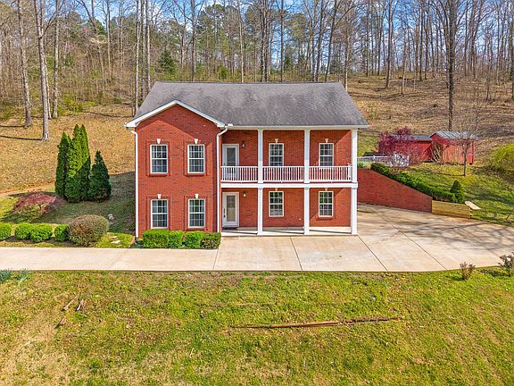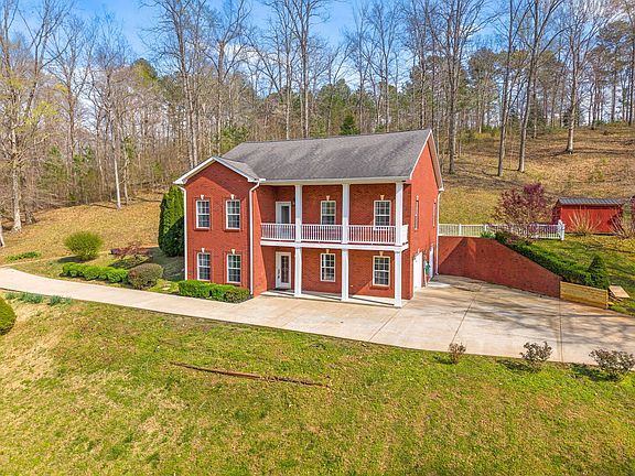 Nestled on over 6 acres, this well maintained brick home offers privacy and adventure. Drive up on either side of the double driveway and enjoy the country scenery, where you can then park in the garage or just outside. Enjoy blueberry bushes and grape vines outside in the garden area. Step inside and relax as you cozy up to the fireplace in the living room or den area. Enjoy a spacious eat in kitchen with ample cabinet space, under counter lights (2024, with 15 years of continuous life from time of install), stainless steel appliances, and a peninsula bar for extra seating. Upstairs to the first floor you will find a spacious primary bedroom (mounted night stands convey), with a private patio area. Pass 2 large walk in closets on either side (with built in systems) as you head to the roomy primary bath, complete with a tub, shower, and separate vanities. Down the hallway you'll find access to a private balcony, overlooking the scenic hillside. Two other spacious bedrooms are around the corner, one with it's own private full bath and the other with it's own electric fireplace. Up on the hill, behind the house, is a flat area with extra building potential. Recent updates include a new farmhouse kitchen faucet, new fridge (2024), fresh gravel on the driveway, and new back patio. All walls, and trim were painted in 2021. Marble floors and carpets have been recently professionally cleaned (carpets have been cleaned annually). Microwave, refrigerator (2024), washer (2021), dryer (2021), water filtration system, under cabinet lights in kitchen, propane tank, and 2 outdoor storage buildings all convey with property.