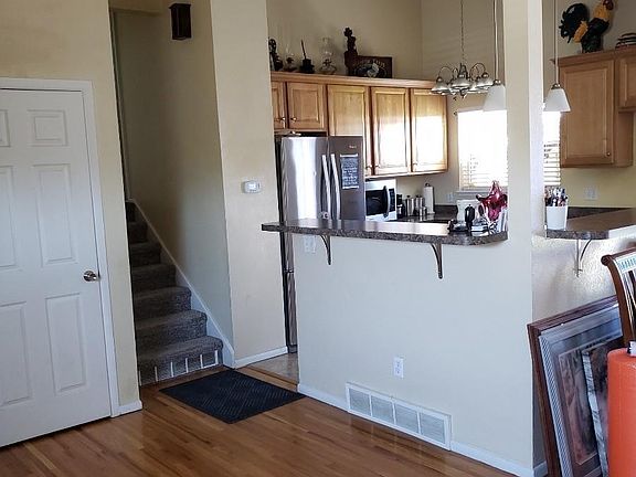 Beautiful updated ranch with views of Pikes Peak form the living room window. Newly expanded back patio with pergola and new sod in the huge backyard. Extra covered parking for truck or RV. Storage shed too! Stainless steel stove. Kitchen island. Open main floor. Newer hot water heaters. Lovely hardwood floors. Walkout basement perfect for a roommate or mother in law. East highway access.