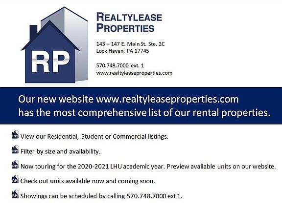 This beautiful historic building is located downtown in the middle of all Lock Haven's charm. It is within walking distance to the West Branch Susquehanna River paved 2.25 mile Levee Trail, YMCA, Shopping, Various Banks, Day Care facilities, Restaurant and LHU trolley route. This secure building has many unique yet affordable apartments full of character. Large windows allow for natural light to create a bright and cheerful atmosphere.3 bedroom apartment in a secure building. *Off-street parking is available at 119 N. Grove Street and *Coin Operated Laundry is onsite. Call to schedule your showing today! 570-748-7000 x1 www.realtyleaseproperties.com Rent includes *heat * water/sewer *trash.