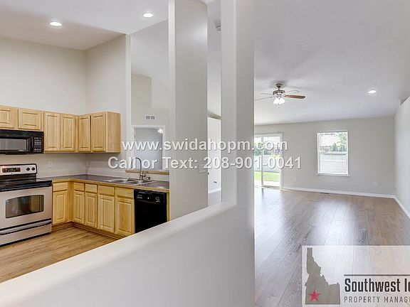 Brand new carpet and paint with beautiful woodgrain plank flooring. Don't miss this super clean single level home with 3 bedrooms and 2 baths, over 1400sqft with a 2 Car Garage. Located in the beautiful Northeast Meridian Solitude Place subdivision near McMillan/Meridian Roads, close to Settler's Park. Bonus, Includes Lawn Care Services! Flexible split bedroom floorplan with an open concept living space and vaulted ceilings with plenty of light, and extremely functional. Spacious backyard with grass and a fully fenced backyard with no direct rear neighbor. Designated laundry room with hookups and plenty of storage. Amazing location with walking paths and parks. Close to Eagle Island Shopping Center, major grocery stores including Costco, WinCo, Walmart, Fred Meyer's and the NEW Orchard Park Village which will have a new Library. Close to Eagle, Star, and Boise. Now accepting online applications, visit our website to apply. Southwest Idaho Property Management. Primary Bedroom Dimensions: 12 x 16, Bedroom 2 Dimensions: 11 x 13, Bedroom 3 Dimensions: 10 x 13. NO PETS. 12 Month Lease, Property Liability Insurance Required (Renter's Insurance). Tenant is responsible for all utilities. Basic Lawn Maintenance Included in total rent price. Tenant must follow all HOA rules/guidelines. The required security deposit/move-in fee of $2400.00 breaks down as follows: Non-refundable administrative fee of $200.00, Refundable security deposit of $2200.00. This information is deemed reliable but not guaranteed, photos are similar. Renter is to verify all information. We do not list on Craigslist, please verify directly with property management. Zillow applications are not accepted. Tenant to supply own washer and dryer.