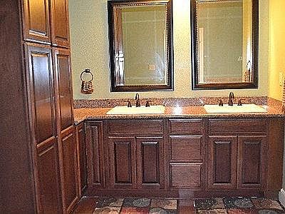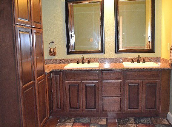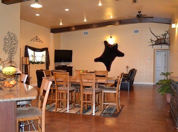 Large open concept with soaring vaulted ceilings. Spacious kitchen with ample amount of cabinet and counter space, granite counter tops, eating bar, double oven, and walk in pantry. Exposed wood beams, stained concrete floors, and custom tiled showers give the home a warm rustic atmosphere. Enjoy the great outdoors on your 840sqft covered patio!