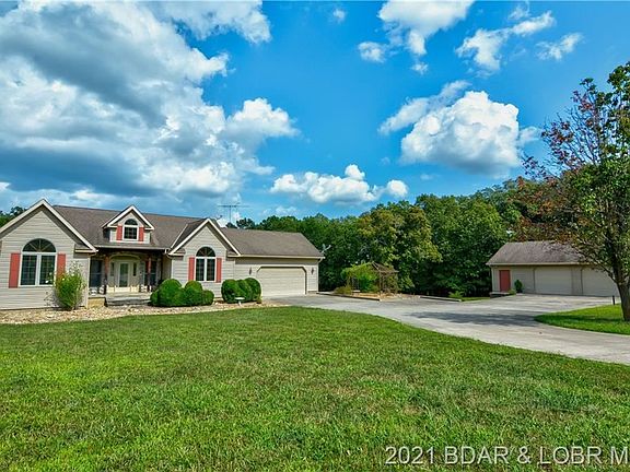 6.5 acre country estate located just off of F road in Sunrise Beach & only minutes from Laurie's, Camdenton's, and even Lake Ozark's conveniences. Private setting with several acres of open yard creating amazing views and wonderful opportunities to watch as deer and turkey pop in and out of the woods. Large home with 4 bedrooms, 3 full baths, cozy main level living room with fireplace, large lower level family room and kitchen/dining area on both levels. If you are a car enthusiast you will appreciate the 2 car attached garage as well as the large, detached garage that has a separate area for a small tractor/mower. Great storage in this home including a concrete safe room in the lower level. A gorgeous drive into the property, complete privacy, lots of decking & a geothermal heat system are all factors that make this home unique. Just off the kitchen is a large dining area that could be used as an office space. With vaulted ceilings, fresh paint & new flooring this is a must visit.