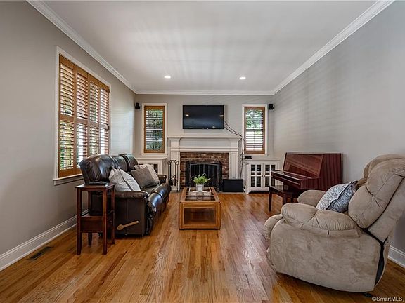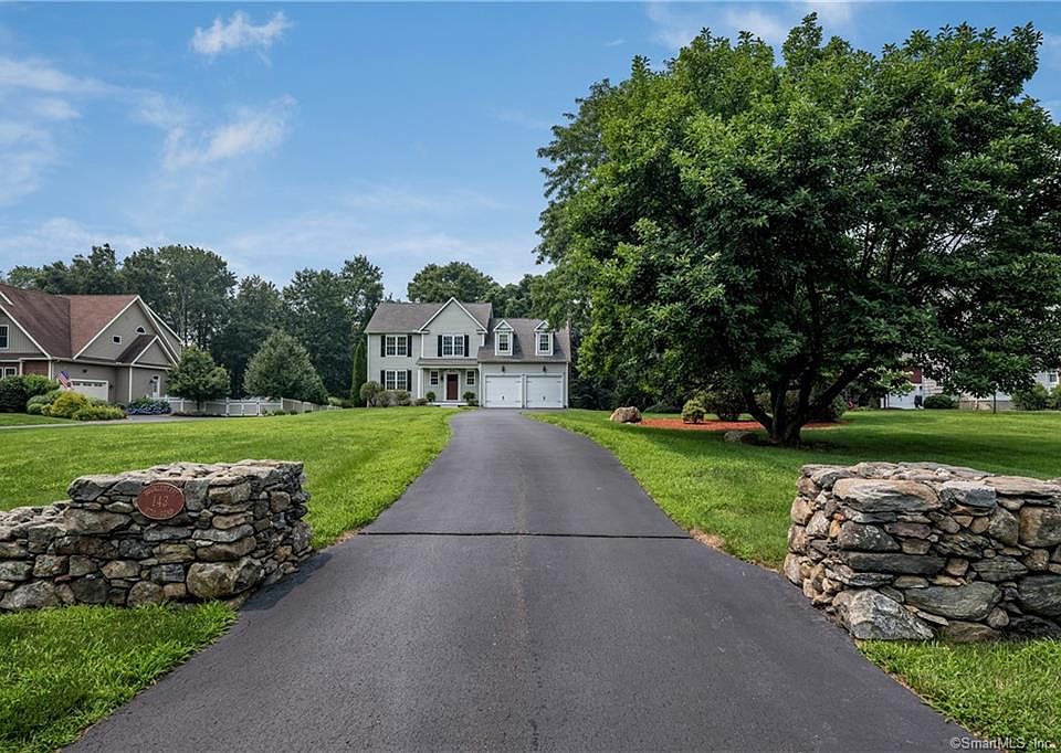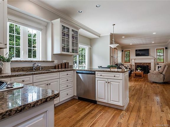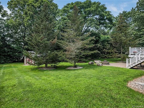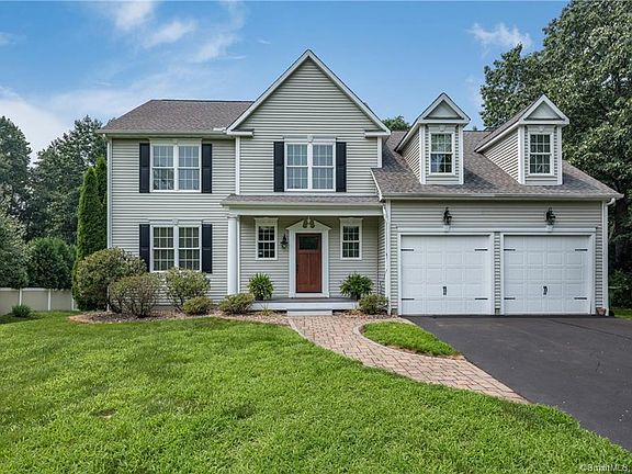 A picturesque stone wall artfully frames the entrance to this newer colonial that welcomes with charming front porch serenely set back on park like grounds. The lush level yard has been beautifully enhanced by brick walkways, patio w/built in firepit, expansive composite deck & offers wonderful privacy to relax and entertain in. Substantial moldings, gleaming hardwood, & 9' ceilings of the main level highlight the exceptional quality throughout the well maintained interior. The crisp white kitchen w/sunfilled casual dining opens to family room w/frpl flanked by built ins & stylish plantation shutters. Both rooms freshly painted in a soothing neutral tone & ready for gatherings of all sizes. Attractive wainscoting detail in the LR & formal DR, each brightened by sparkling oversized windows overlooking the peaceful setting. Upstairs the newly painted owners suite w/tray ceiling & spa style bath is joined by 3 addt'l bedrooms, one with beautiful built in bookshelves, and 2 addt'l well appointed full baths. Fun and games are easy to enjoy in the finished LL w/half bth and surround sound speakers Town water and natural gas. Convenient to the shops,restaurants, & river access of the nearby quaint village of Collinsville