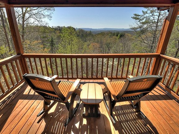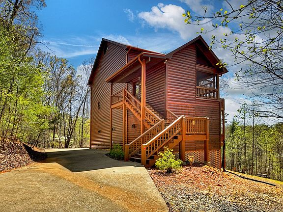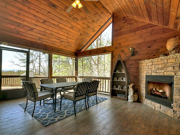 Experience refined mountain living in this gorgeous 3BR/2.5BA cabin with sleeping loft nestled on 1.88 private acres in Morganton, GA. Spanning 3,093 sq ft. With an amazing rental history, this exquisitely maintained home is offered fully turn-key with upscale furnishings and quality touches included. Enjoy breathtaking, long-range mountain views and unforgettable sunsets from nearly every room. The main level welcomes you with vaulted ceilings, rich wood finishes, and an open-concept living area anchored by a striking wood-burning fireplace. Entertain effortlessly in the chef's kitchen, newly renovated with premium appliances, custom cabinetry, and every culinary necessity imaginable. Step outside to the spacious screened-in party porch with a cozy fireplace and lots of room for entertaining. The spacious master suite features a private balcony, perfect for morning coffee with a view. The terrace level offers a complete entertainment zone—game room, bar area, home theater, large guest suite, full bath, and laundry room. With four total fireplaces, including a scenic outdoor fire pit, this home is designed for both luxury and comfort. Additional highlights include ample parking, high ceilings throughout, and thoughtful finishes that create an inviting yet elevated atmosphere. Whether you're seeking a private mountain sanctuary, or a high-end short-term rental investment, this property truly has it all. Within minutes to Aska Adventure Area, Lake Nottely, Lake Blue Ridge, wineries, golf courses, and fine dining.