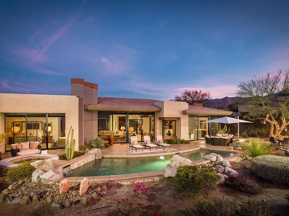 This is a lovely home with dramatic mountain views. Located on the 4th fairway of BIGHORN'S Mountain golf course, the exposure offers all day sun within a south side garden, complete with citrus trees and lawn. The entertaining patio around the pool and spa enjoy sunsets with west exposure. Fire lounge with soft seating and large Tucci umbrella for shade. The open floor plan offers a very expansive view from the front entry glass doors, and the great room concept includes a cozy living room with fireplace and TV, a wet bar, a dining room and gourmet kitchen. A master suite and guest suite inside the home are very private from each other. A second interior guest suite is currently furnished and used as an office. A detached guest suite makes a nice getaway with a kitchenette, built-in media, full bath with double vanity and large walk-in closet. Great proximity to amenities, walking distance to Dog Park, Marketplace and Starbucks. Furnished very nicely and ready for immediate occupancy.