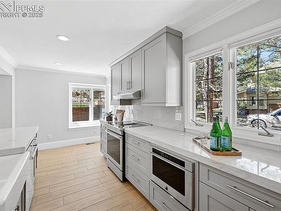 Refined Colorado Elegance in the Heart of The Broadmoor. Welcome to an exceptional blend of luxury and lifestyle in one of Colorado Springs' most sought-after neighborhoods. Perfectly situated in the established Broadmoor area - meander on a level sidewalk just minutes to fine dining, boutique shopping, medical offices, The Country Club of Colorado and trails/mountain access. Cheyenne Mountain State Park and Fort Carson are nearby. This sophisticated residence offers elevated main-level living with generous space, timeless finishes, and captivating mountain views. Custom remodel in 2022, the home exudes natural light and calm, neutral tones throughout. The gourmet kitchen is a true showstopper, featuring a striking 7-foot marble island, designer lighting, a ceramic farmhouse sink, and top-tier JennAir appliances. Whether you’re enjoying your morning coffee in the cozy breakfast nook or taking in mountain vistas from the covered patio, every corner invites relaxation and connection. The living room is both grand and inviting with vaulted ceilings and a sleek gas fireplace—an ideal setting for intimate evenings or elegant entertaining. Flowing seamlessly from this central space is the expansive primary suite, a true retreat with dual walk-in closets and a spa-inspired en-suite bathroom, boasting a zero-entry double rainfall shower and double vanity. Upstairs, discover an oversized secondary bedroom, a full bath, and a versatile loft space that stuns with an additional fireplace—perfect as a home office, library, or lounge. The fully finished, unpermitted lower level offers incredible flexibility with a spacious family room, a non-conforming 3rd bedroom/private guest quarters, and a 3/4 bath—ideal for hosting in comfort. Throughout the home, premium lighting, elevated mirrors, and curated fixtures create a cohesive, polished aesthetic. Light, bright, and luxuriously comfortable, this home effortlessly combines modern updates with a warm, inviting ambiance.
