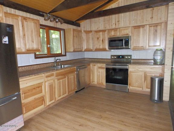 2 STORY ON A CORNER WITH HUGE DECKS On a hilltop corner parcel, Raised Ranch has been completely remodeled with new kitchen with new appliances, laminate floors, baths and more, offers living room with Cathedral ceiling, brick fireplace, country kitchen plus dining with doors to huge deck, 4 good bedrooms, 2 full baths, den, hot air heat, garage and 2 story decks.