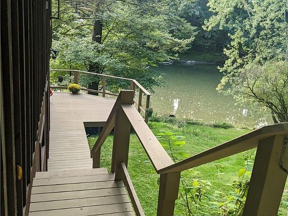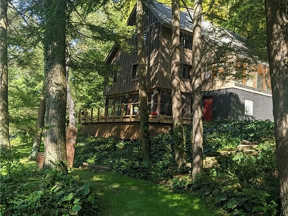 Waterfront property, Unique, one of a kind post & beam home withn extensive frontage on both sides of Slippery Rock Creek with easy water access. Minutes away from Moraine State Park, McConnell's Mills, and convenient access to Rts 19, 422, & I-79 The 7.5 acres provides privacy, solitude & tranquility. Broken back saltbox design home has a central chimney structure, 3 fireplaces, huge wrap deck, screened in porch and walkout basement, providing panoramic views of the creek and grounds.Kitchen with oak cabinets, tile countertop, brick bake oven has a 10' island with cooktop, bar sink, & butcher block countertop. Two bedrooms, walk in closets, two baths & large windows that bring the beauty of outdoors in. Light pours in through 216 sq. ft. sunroom open to 1st and 2nd floors. This timber frame home is a copy of Jeffords tavern that was built in York, ME in 1750, with the same broken back saltbox design & 3 Rumsford fireplaces. Enjoy fishing, kayaking & swimming in your own front yard.