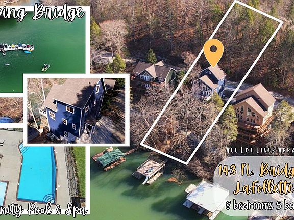 Escape to Blue Moon at 143 N. Bridge Lane in LaFollette, TN, a luxurious lakefront home located in the exclusive Lakeside Estates community. This spacious waterfront home with double decker dock comfortably sleeps 22 guests, offering the perfect setting for families, and large groups, seeking a relaxing lakeside getaway or multi-generational living. Blue Moon features updated flooring, composite decking, a new hot tub, and a commercial ice maker and is coming completely furnished and ready to start enjoying this lake season, or get rented seamlessly. Conveniently located near Sugar Hollow Marina, Deerfield Resort, Tiki Hut, and Springs Dock, this home offers the best of both lakefront fun and relaxation.