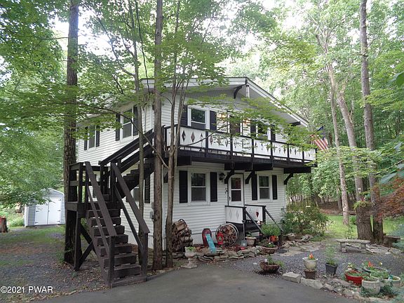 CHARMING 2 STORY HOME WITH MANY RENOVATIONS. Come see and enjoy this sweet country home surrounded by nature and its beautiful gardens. There is even a tranquil pond with gold fish to feed. This home boasts 2 bedrooms, 1.5 baths, hardwood floors, renovated kitchen with stone countertops and appliances. Living Room offers wood stove insert and skylights for lots of natural light. Main bedroom is extra large with glass doors to a private stone patio. It also has a Laundry room, study/den/office along with a sunroom with glass windows surround. Sit on your rocking chair and look out over the gardens from the upper deck. Located in an amenity filled community with one of the larger lakes in the area for boating, fishing and swimming. Welcome Home!