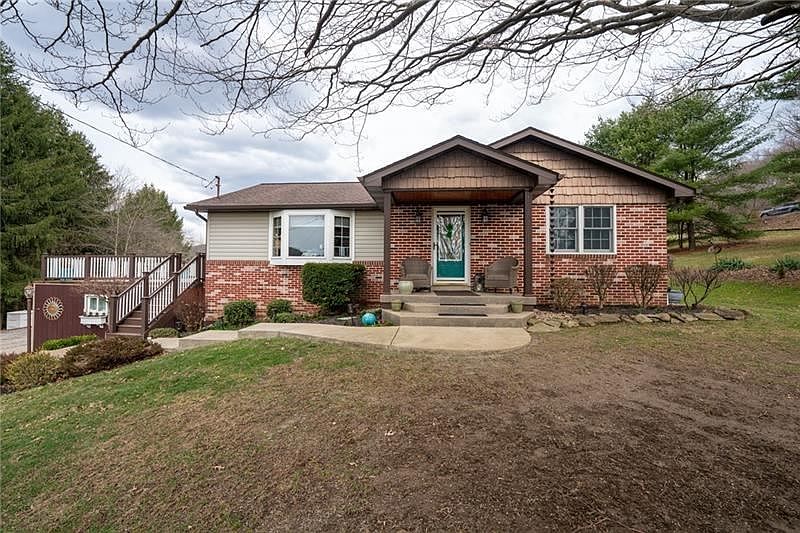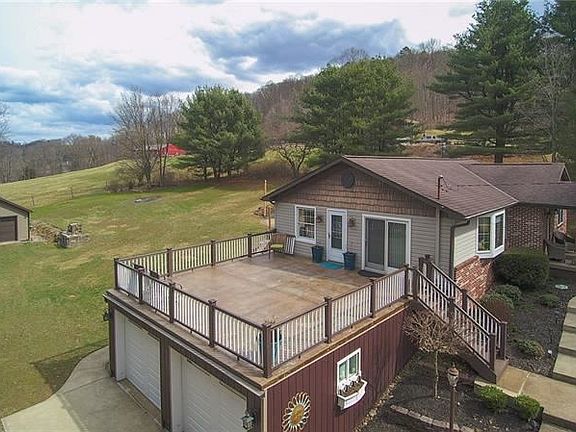 On the edge of Raccoon Creek State Park and surrounded by beautiful views of the countryside, this 3 bedroom ranch, with brick façade, sits on a full acre and has been exceptionally maintained over the years. Spacious rooms throughout. The full basement features a finished game room w/ wood burning stove, laundry room and mudroom. There are two outdoor entertaining areas. Just off the kitchen, the 24x24 deck sits atop the 2 car garage. There is a second patio behind the house. Lots of outdoor space! A 20x14 Weaver Barn offers plenty of room for lawn equipment and tools. Excellent storage both inside and out. One year home warranty included.