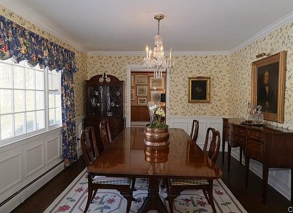Classic Connecticut center hall colonial well sited on 2+ private acs. This delightful home is drenched in sunlight & offers a fabulous open floor plan for todayâs lifestyle & entertaining. The heart of the home is a recently remodeled kitchen & cathedral ceiling, beamed FR featuring a fpl & 3 walls of windows w/ French doors that open to a wraparound deck. A bright LR w/fpl, DR, library & wet bar complete the 1st floor. There is a large walk out playroom on the lower level.