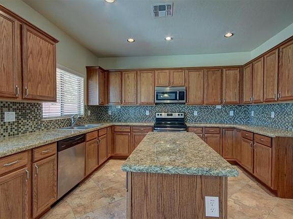 2 STORY TILE AND GRANITEYou can have it all! Wood and iron banister, diagonally laid tile floors, granite counter tops with tile back splash. Gorgeous! Kitchen island with so much counter top space, stainless steel appliances including smooth top stove, built in microwave and dishwasher, stylish cabinet handles. Formal living, dining, family rooms and 1 bedroom downstairs. 4 bedrooms and loft upstairs. Ceiling fans and two tone paint thru out. Master includes separate shower and garden tub, dual sinks and walk in closet. Fully landscaped backyard with covered patio, paver patio and grass. This one is sharp!