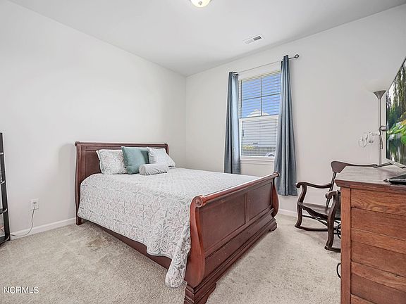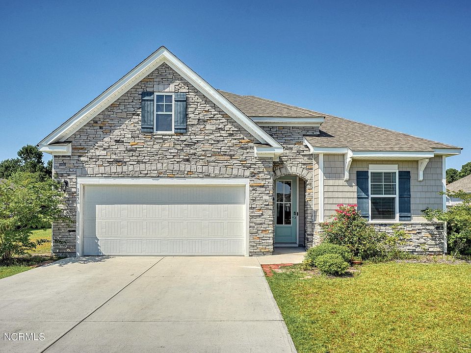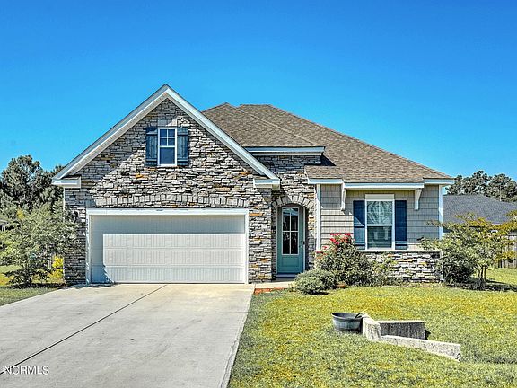 Charming single-story home located in the desirable community of The Sound at Washington Acres. Boasting 3 spacious bedrooms and 2 full bathrooms, this residence sits on a generous 0.35-acre lot, offering ample space both inside and out. The home's exterior exudes curb appeal with its tasteful combination of stone and shake siding. Step inside to find a thoughtfully designed split floor plan, with two bedrooms situated at the front of the home, providing privacy from the master suite located at the back. The living spaces feature wide LVP flooring, while the bedrooms are cozily carpeted. The heart of the home is the kitchen, which features granite countertops, sleek stainless steel appliances, and a large kitchen island that overlooks the living and dining areas, perfect for entertaining and family gatherings The master suite is complete with a spacious walk-in closet and an ensuite bathroom with his-and-her vanities and a walk-in shower. The two additional bedrooms share a well-appointed full bathroom, and the dedicated laundry room adds convenience. Outside, the large fenced-in backyard is ideal for outdoor activities and furry friends! The 2-car garage offers plenty of storage and parking space. This home is ideally located close to the Intracoastal Waterway, shopping, dining, and boat ramps, ensuring you have everything you need within reach. Additionally, it's situated within the coveted Topsail school district.