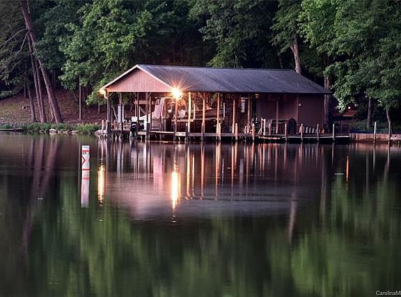 Spectacular lake home on 2 waterfront lots with enormous 2-slip boathouse with extra spacious open decking. This home has so much to offer! Beautiful setting, fabulous great room with cathedral ceiling, wooden beams and a one-of-a-kind stone fireplace with gas logs sitting center stage. Nice kitchen with lots of cabinets and dining area overlooking the lake. Pretty sunroom. 2 large bedrooms on the main with their own private full baths. In the basement is a bonus room with a fireplace and its own private bath, ready to be used as a den, office or for guests! Large storage area and bar located at the boathouse! Seawall, beautiful view of the lake and Morrow Mountain State Park! Great location in a quiet cove.