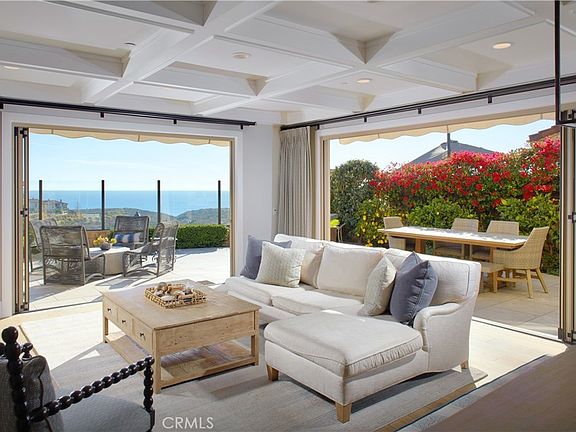 Nestled in the sought-after Aqua community of Sea Summit, San Clemente, this stunning coastal retreat offers breathtaking panoramic ocean views and seamless indoor-outdoor living. Positioned on a premier ocean-view lot, this home epitomizes effortless luxury and serene living. Beyond the walk-in entry foyer, dual La Cantina glass walls open to unobstructed sit-down ocean views from the living and dining areas, filling the space with natural light. High-end designer finishes elevate the home, from European oak flooring to coffered ceilings, custom smooth-surface walls, and wainscoting. The gourmet center-island kitchen is a chef’s dream, equipped with Wolf appliances, a 48" Sub-Zero refrigerator, a farm sink, and a custom-tiled bar area with decorative tile and oak shelving. A spacious laundry/craft room is conveniently located nearby. Upstairs, a long hallway with a built-in desk niche leads to two private bedrooms, each with its own bath. The primary suite is a true sanctuary, offering 180-degree ocean views, a luxurious spa-like bath with a soaking tub and oversized walk-in shower, and high-end finishes throughout. Make your way outside to a private entertainer’s backyard, complete with a built-in fireplace, a Lynx BBQ with a warming oven and fridge, custom hardscape, and a retractable shade awning—all set against the backdrop of the Pacific Ocean. Additional features include an epoxy-floored garage with built-in cabinets and storage racks. Residents enjoy access to The Summit Club, featuring a clubhouse, gym, pool, and spa, as well as over four miles of scenic ocean-view trails. Just moments from world-class beaches, shopping, and dining, this home offers the ultimate in refined luxury. Leave your car keys behind and embrace the coastal lifestyle—everything you need is within easy reach.