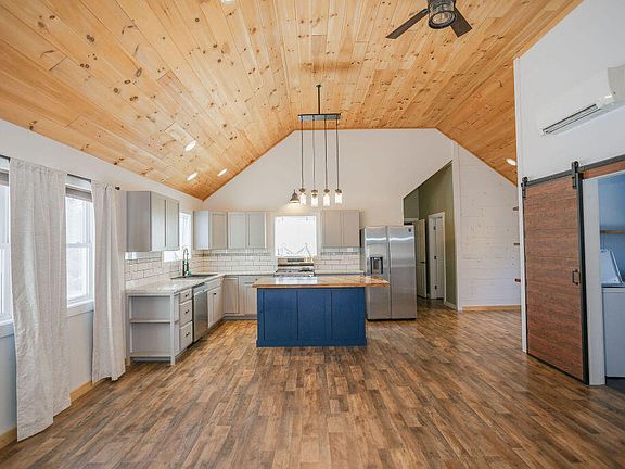 Propane wall heaterIsland with storageKitchen boasts beautiful cabinetsInterior stone chimney