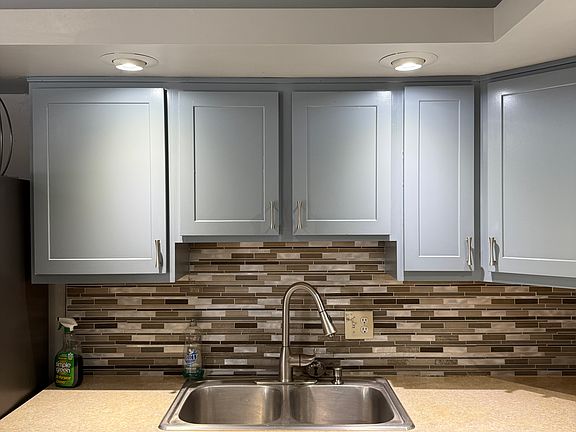 The kitchen features sleek two-tone cabinetry, a tile backsplash, a center island, and stainless-steel appliances perfect for cooking and entertaining. Bedrooms are spacious with generous closets, and the full bath showcases contemporary tilework and recessed lighting.