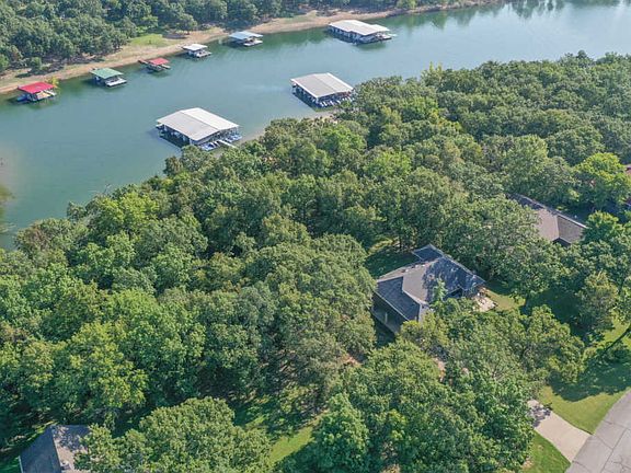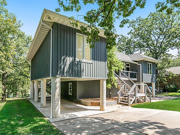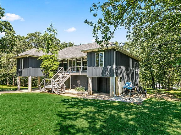 Contemporary, 5 bedroom 4 full bathroom home on Table Rock Lake! This gorgeous, two story home offers open concept layout, living area with vaulted, wood accent ceiling with skylights and tons of huge windows providing natural light and beautiful views of the lake. Kitchen has a huge center island with seating, pendant lighting, open shelving, Quartz counters, stainless steel appliances and walk-in pantry. Master Suite features a wide plank barn wood wall with floor to ceiling windows and bathroom with dual sink vanity and tiled walk-in shower. There are three additional bedrooms on this level; one that has its own full bathroom and the other two share a Jack-and-Jill bath. A custom, industrial style stair case leads to the main level where you will find a second living area, 5th bedroom, full bathroom and spacious laundry room with sink & cabinet space. Large deck and covered patio out back are a great place to entertain or sit and enjoy the views of the lake. Quick and easy access to the water/dock located directly behind the home. The elevated design of this home allows for two parking spaces beneath the home plus a John Deere room. Call to schedule your private showing today!