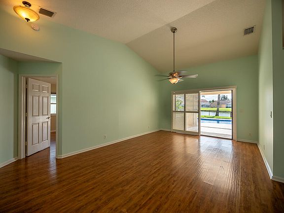 Charming Lakeview and Pool Home with Modern Touches, in a NON-HOA community, so bring the boat! This 3 bedroom, 2 bathroom, 2 car garage home offers laminate flooring throughout, plantation shutters, elevated knockdown ceilings, freshly painted bedrooms, a central vacuum system and much more! A modern kitchen is equipped with stainless steel appliances, quartz countertops, wood shaker cabinets, a large island and a stainless steel vent hood. The kitchen also features double wall ovens and a sleek glass stovetop, perfect for the chef in your family. The spacious master suite features patio access, a walk-in closet, and a newly remodeled en-suite. The bathroom is a crisp and clean retreat with a double vanity, quartz countertops, a free-standing tub, a frameless glass shower, wood tile plank floors, and recessed lighting. Barn doors lead you into the indoor laundry room with ample storage cabinets and shelves. Outdoors, enjoy beautiful sunrises over the lake with your morning coffee from your backyard oasis! The covered patio is perfect for entertaining and is equipped with ceiling fans, bar countertop and cabana bathroom. The yard is completely fenced in and the salt water pool was resurfaced. Other key features include hurricane impact windows and doors, partial shutters, and a roof that is only 5 years old. The A/C is 6 years old, and the property includes solar attic fans, a solar water heater (installed in 2010), a hurricane impact garage door, and a brand-new garage door opener. The garage also offers shelves, cabinets, and a workbench for added convenience. Schedule your showing and come and see all that this property has to offer!