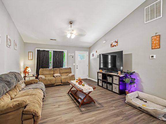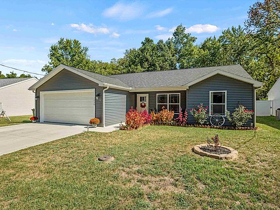 Recently built in 2022, this home is basically brand new! It is all one-level with a split floor plan featuring 3 bedrooms and 2 baths with no steps and stunning front landscaping. Inside you’ll be greeted with open-concept living with a spacious living room that opens into the kitchen and dining area. The entire home features vinyl flooring with an easy to keep clean color scheme. This home features trendy but neutral colors with gray walls, white trim, and white bathrooms. The white and bright kitchen features an island with space for barstools, stainless steel appliances, plenty of cabinet and countertop space, shaker white cabinets, and a separate pantry. The laundry room is conveniently located off of the 2 car attached garage. The primary suite features a large walk-in closet. The seller has recently added a white vinyl privacy fence throughout the large, flat backyard and a storage building that will convey. The best part, all of the major appliances and roof are only 2 years old!
