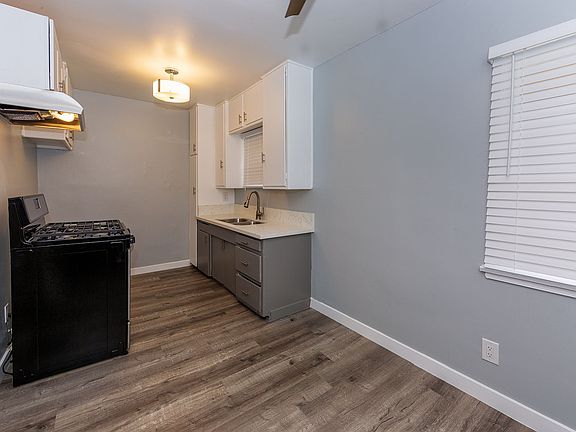 Stove and ovenWell-kept practical spaceEfficient kitchenVinyl flooringGarbage disposalRange hoodWindow coverings