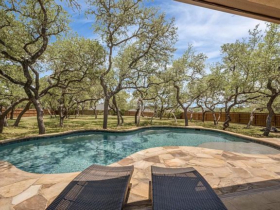 Gorgeous one story Spanish style 3 bedroom, 3 full bath custom home is situated among over 50+ manicured live oak trees on one acre in the Texas Hill Country in Spring Branch in the gorgeous community of The Crossing at Spring Creek. Beautiful open entry invites you into this fabulous split plan home. You'll find an impressive chef's kitchen ideal for your entertaining needs, offering custom cabinetry and oversized kitchen island. Enjoy your hard work from the kitchen in the separate dining room or enjoy dinner on the oversized back patio in front of the outdoor fireplace in the outdoor living space. Floorplan has a great flow for gatherings and pool parties and has full bath access off patio for your wet swimsuit guests! True office space with double French doors for working remote. Enjoy the secondary living space as a flex room to meet your lifestyle needs. The primary bedroom has soaring ceilings, tons of natural light, situated overlooking the backyard full of oaks. Enjoy soaking in the large jacuzzi bath or rinsing in the oversized walk through shower. Secondary bedrooms share a Jack and Jill bath and offer large walk in closet storage. Relax in the backyard oasis enjoying Hill Country sunsets! Oversized covered patio offers multiple sitting arrangement opportunities around the Keith Zars in-ground pool with flagstone decking. Store you toys in the oversized side entry garage and storage racks. Enjoy fishing in the community pond or feeding the neighborhood deer. Hill Country living awaits!