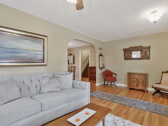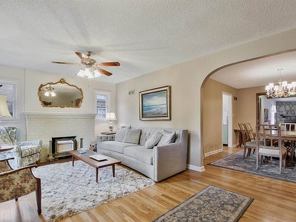 Charming full brick Riverside Tudor, featuring inviting front porch with porch swing. 3 BR, 2 Bath, 2 car garage, room in basement acts as family room with fireplace, tons of storage. Beautiful hardwood floors and all new windows, insulation (blown-in fiberglass) added in attic. Kitchen and charming breakfast nook remodeled in 2019, all new cabinets, quartz counter-tops, farm sink, new electrical circuits, chambers gas stove, LED lights in ceiling and above cabinets. New blinds, newer sewer line, and gutter guards. Master bedroom suite upstairs, charming patio and awesome landscaping by Ryan Lawn Service. Items can stay! mirror above living room fireplace, basement pool table, couch and recliner, end tables, and electric fireplace in living room.
