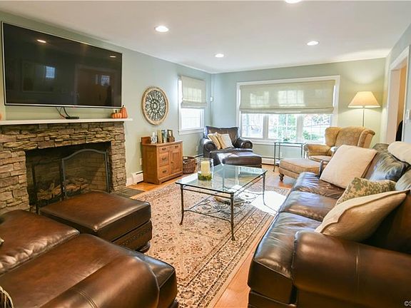 First time offering of this meticulously maintained Colonial This home features 5 bedrooms, 5 full baths, gorgeous remodeled kitchen with large island, granite counters, stainless steel appliances, wood burning fireplace, dining area & butlers pantry, living room with gas fireplace, office, full bath with tiled walk-in shower, inviting foyer, mudroom and covered breezeway porch complete the 1st floor of the main house. 2nd floor has a master bedroom walk in closet and full bath double sinks, walk in shower and soaking tub, 3 additional bedrooms over sized closets and laundry area complete the 2nd floor. The walk out lower level has a cozy family room wood burning fireplace, full bath & bar. This home also offers a one of kind in-law apartment access from main house and separate exterior entrance. Apartment has fully functional kitchen island & granite counters, dining room, living room, large bedroom, full bath walk in shower and laundry room. Not to be forgotten is the outdoor space of this home, expansive 4.3 acre lot is professionally maintained multi-level decks which you can access from kitchen, mudroom and dining room in the in-law apartment. Huge patio built in fire pit & 30x50 custom Gunite Scott Pool, pool house along with views of a beautiful brook and your very own bridge Detached multiple vehicle garage tons of storage above.plenty of parking in your circular driveway. New boiler and indirect hot water heater Agent related to owner.