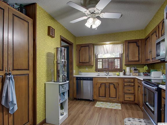 Great location for this solid brick ranch home! Some updates including paint, vinyl flooring, & kitchen appliances. Lower level has living area, recreation room and other room w/bar for more entertaining area. Main floor stackable laundry unit conveys. (lower level washer does not convey) Fireplace has been capped. Covered patio and large yard is perfect for entertaining area. Inspections welcomed, selling as-is. Enjoy the quiet neighborhood while still being close to town.