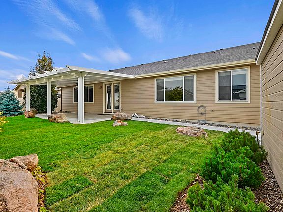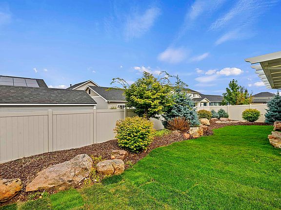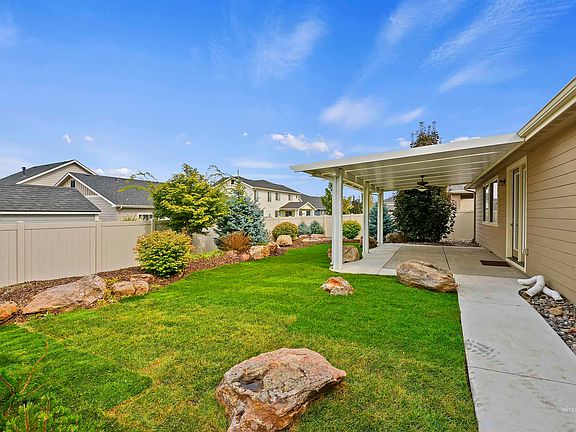 PRICED TO SELL! NEWLY LANDSCAPED! SECOND HOME, BARELY LIVED IN: This stunner features a beautifully landscaped private backyard with a mini shop/shed & covered patio, including skylights & fan. Inside you will find abundant natural light, gorgeous finishes, & a beautiful neutral color palette. You will love entertaining in the open-concept design that includes a formal dining room, family room w/cozy gas fireplace, breakfast nook, & a gourmet kitchen that boasts stainless steel appliances, gas range, oversized island, large walk-in pantry w/ample storage, beautiful granite countertops accentuated by fashionable subway tile, & a built-in desk. The master suite is no less impressive w/a split bedroom configuration making it a tranquil retreat, his & her walk-in closets, a large ensuite w/dual vanities, & separate lavish bath & tile shower. This quiet community boasts a pool, clubhouse, & playground. Perfect location--close to schools, downtown Meridian, The Village & more! Quick & easy access to the interstate!