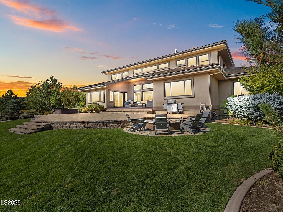 Welcome to your custom-built home in the heart of the coveted Saddlehorn neighborhood. Nestled on a quiet court, this stunning modern home boasts luxury and comfort in a modern aesthetic. Natural light floods the space through picturesque windows overlooking the Virgina Range and Sierra Nevada Range, inviting you to unwind and entertain in style. Step inside to discover high-end designer touches throughout, from the soaring ceiling in the great room to the modern LED fireplace. Enjoy the convenience of 6 bedrooms (one currently being used an office), one private guest bedroom upstairs and 4 bedrooms downstairs, including the primary suite on the main floor. The primary suite offers an ensuite bathroom with two separate sink/counters and separate walk-in closets. 4 1/2 total bathrooms and all have been meticulously updated with designer finishes.