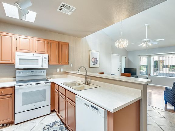 Great Vaulted Socorro 2 bed 2 bath Split plan .condo is fully furnished and move-in ready. Both bedrooms have their own bathrooms, perfect for guests. The Vaulted Ceilings give a much more ''roomy'' feel. Windows, Heat pump, and water heater all replaced. Tile and laminate flooring. Huge North facing patio! Sun Village is a 55+ Gated, Resort Style Community. Enjoy the par 3 golf course, gigantic heated pool & spa, pickleball, tennis, fitness gym, woodshop, billiards, onsite entertainment in our ball room and onsite restaurant! Sun Village, is a gated, security guarded, age 55+, community, in the city of Surprise, Arizona. This small community is made up of just under 1400 homes and condominiums. The Sun Village Community has an 18 hole, par three "no-"riding" golf course, an heated swimming pool and spa, tennis, pickle ball and shuffleboard courts, horseshoe pits, an exercise room, a billiards room, sewing and crafts rooms, and a ballroom where national and international entertainment can be enjoyed.