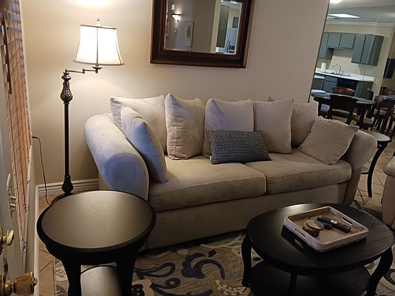 Highly desired location overlooking the clubhouse and pool (not the road). Fully furnished. Bright living room has a queen sleeper sofa and bedroom has a king bed. Large closet and two dressers. Washer/dryer in unit. Upgraded furnishings and new linens, dishes etc. Reserved carport and locked storage unit are included.