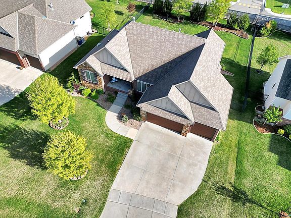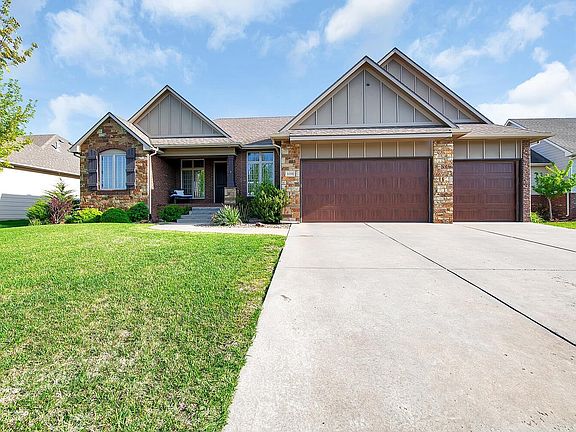Welcome to your home in the highly desirable Garden Walk neighborhood — a rare find offering space, comfort, and style at an exceptional value. As you approach, you’ll be drawn in by the home’s beautiful curb appeal, complete with a manicured lawn, charming front porch, and low-maintenance 2” insulated Clopay garage doors. Step through the front door and into a warm, open layout where hardwood floors and rich knotty alder woodwork set the tone for timeless elegance. The living room’s soaring vaulted ceilings, custom built-ins, and gas fireplace create an inviting atmosphere perfect for gatherings or relaxing evenings at home. The heart of the home is the stunning kitchen, where style meets function. Enjoy cooking and entertaining around the oversized granite island, surrounded by stainless steel appliances, a generous walk-in pantry, and deep wood cabinetry. The spacious dining area overlooks the backyard, allowing natural light to flood the space and making every meal feel special. On the main level, the main suite provides a serene escape with a tray ceiling and a spa-like private bath featuring dual granite vanities, a luxurious soaker tub, brand newly remodeled granite walk-in shower, and a spacious walk-in closet. Two additional bedrooms, a full bath, and a convenient laundry room round out the main floor in this smart split-bedroom layout. Head downstairs to a finished walk-out basement designed for effortless entertainment and everyday enjoyment. The expansive recreation area flows seamlessly into a game zone and casual dining space, enhanced by built-in surround sound. The impressive granite wet bar offers ample counter space, and tile flooring and beautiful cabinetry—ideal for hosting movie nights or weekend get-togethers. Two additional oversized bedrooms, a full bath, a versatile bonus room, and abundant storage complete this walk-out level, offering flexibility for guests, hobbies, or a home office. Step outside and fall in love with the peaceful backyard setting. A covered deck invites you to enjoy morning coffee in the shade, while the spacious patio below sets the stage for outdoor entertaining or quiet evenings under the stars. The wrought iron fencing, sprinkler system, and thoughtful landscaping create a backyard that’s both functional and beautiful. With a new roof in 2019, freshly shampooed carpet, and granite throughout, this move-in ready home reflects true pride in ownership. Conveniently located near shopping, dining and offering Wichita taxes within the Andover School District, this opportunity won’t last long!