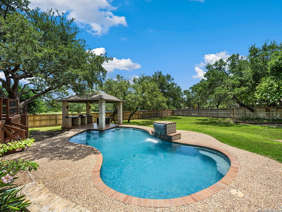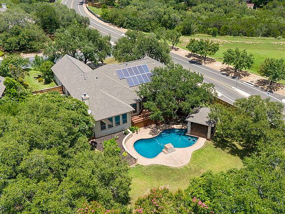 Welcome to a thoughtfully designed Hill Country home nestled on a tree-filled lot, where outdoor living shines and every detail has been carefully curated. The expansive backyard is a private oasis, boasting a sparkling pool with a tranquil water feature, lush landscaping, and an elevated deck perfect for unwinding or entertaining. A covered pavilion with a built-in grill invites memorable gatherings, while a spacious tiled patio ensures year-round enjoyment. Energy-efficient solar panels add to the home's long-term value and sustainability. From the moment you arrive, the home impresses with its striking curb appeal-an elegant brick facade, arched entryway, and a three-car garage blend classic style with functional design. A solid wood front door with iron accents sets the tone for the warm and welcoming interiors. Inside, rich wood floors and a bright, open layout create a warm and inviting atmosphere. A private study just off the entry-featuring glass-inset French doors and serene front garden views-offers the perfect space for working from home or quiet reflection. The formal dining room, flanked by distinctive brick columns, leads into a chef-inspired kitchen equipped with custom cabinetry, solid-surface countertops, stainless steel appliances, a gas range, and a raised breakfast bar with charming brick accents. The adjoining breakfast area enjoys lovely backyard views and opens to a spacious living room anchored by a cozy fireplace and timeless tile flooring. The primary suite serves as a true retreat with its own sitting area, direct backyard access, and soft natural light. The luxurious en suite bath offers dual vanities, a soaking tub, a glass block walk-in shower, and ample storage. Three additional bedrooms are generously sized and share a well-designed full bath with double sinks and a separate tub/shower for added convenience. Whether you're savoring quiet mornings under the shade trees, lounging by the pool, or entertaining guests under the pavilion, this exceptional home offers the perfect blend of comfort, privacy, and Texas Hill Country charm. "Please be aware that some photos have been virtually staged."