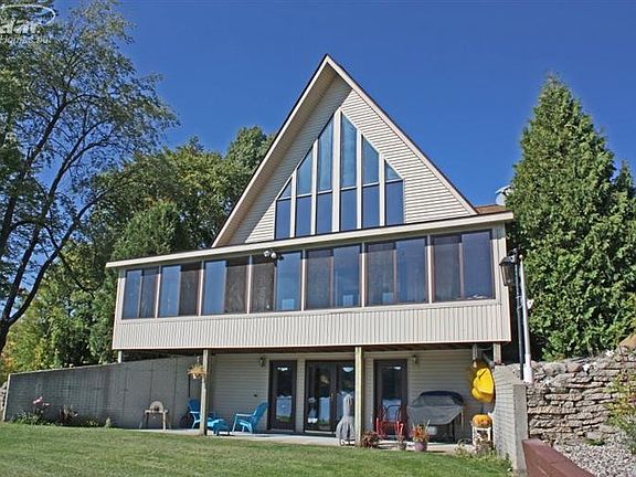 Amazing view, privacy setting & expansive frontage on McCaslin Lake. Sandy beach & great dock & fishing! Chalet style home w/master suite on both floors w/whirlpool bath. Finished walkout w/wood burning stove that heats the home with LP furnace backup. Yorktowne hickory kitchen w/all appliances. 1st fl laundry. 30x40 heated insulated pole barn/workshop w/1 bdrm guest house apartment. Sunroom w/windows galore. Security alarm.