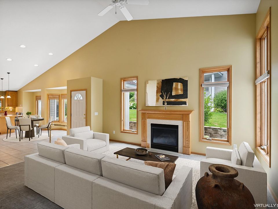 BEAUTIFUL, spacious, end-unit with vaulted ceilings and open floorplan set in a quiet location surrounded by mature trees. Generous sized rooms stream south facing sunlight with oversized & transom windows. French doors lead to a 4-season sunroom, which opens onto a private deck. The kitchen is centered around a spacious center island with additional room for eating-in as well as a separate dining area. You'll enjoy a full main floor laundry room and a back hall with ample storage. The owner's suite has a large walk-in closet, huge bathroom with dual sinks, a jetted tub and separate shower. The lower level has a 2nd gas fireplace and French doors which lead to a large office area (or 3rd bedroom), as well as another bedroom with a walk-in closet and 3/4-bath. Move in and enjoy being in this quiet community that is convenient to shopping, dining, and walking trails. Updates include a newer roof, luxury carpet on the main level, newer water heater, softener, and humidifier.
