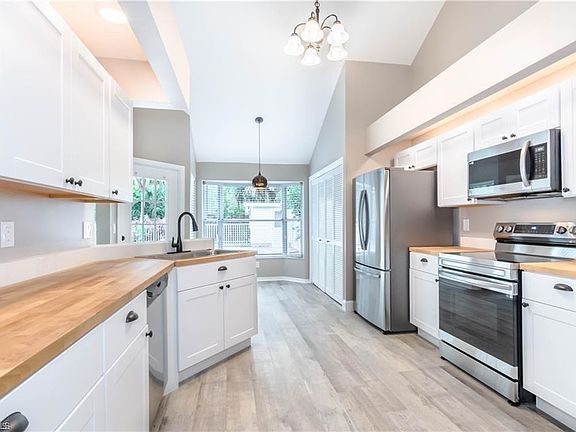 Largest Remodeled Villa in Berkshire Village – Private Pool, Spa & Spacious Garage. Experience the perfect blend of space, privacy, and style in the largest villa in Berkshire Village. This fully remodeled 3-bedroom, 4-bath home is tucked beside a tranquil preserve and features an oversized resurfaced pool and spa, surrounded by tropical landscaping with guava and papaya trees. A poolside cabana bath and outdoor shower complete the ideal outdoor oasis. Inside, the great room centers around a rare wood-burning fireplace, while the sunny breakfast nook and formal dining room offer perfect spaces for everyday living and entertaining. The first-floor master suite includes a walk-in closet, soaking tub, separate shower, and dual vanities. Two additional bedrooms and baths, a charming play nook under the stairs, and updated finishes throughout add comfort and character. Recent upgrades include a new roof, new HVAC system, new appliances, and a fully finished detached two-car garage—ideal for a mechanic, hobbyist, or anyone needing extra workspace. Best of all, this home is not in a flood zone, offering added peace of mind and long-term value. Located just steps from the community heated pool and tennis/pickleball courts, and only minutes from I-75 and downtown Naples, this villa delivers relaxed, resort-style living in one of Southwest Florida’s most convenient and desirable locations.