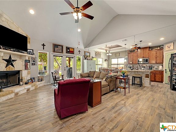 Elegantly crafted by Havenbrook Homes, this exquisite residence emanates a sense of timelessness. Pristinely maintained, it exudes an aura of newness. Set upon a sprawling half-acre lot, a captivating vista unfolds - neighborhood deer graciously traverse amidst the backdrop of mature oaks. Within, a culinary haven awaits in the open kitchen, adorned with granite countertops and a central island. The living room is a visual masterpiece, featuring a stone fireplace that gracefully ascends to the lofty ceilings. Custom wood-paneled ceilings grace the entry hall and dining room, accentuated by numerous archways throughout. Unveil the allure of a hill country paradise from the covered patio, offering a sanctuary for relaxation and captivating rear hill country vistas. Revel in this idyllic setting upon a half-acre canvas within Rocky Creek Ranch, perfectly poised to admire the natural surroundings. Seize this opportunity to own a superb dwelling in the heart of Texas' water recreation haven