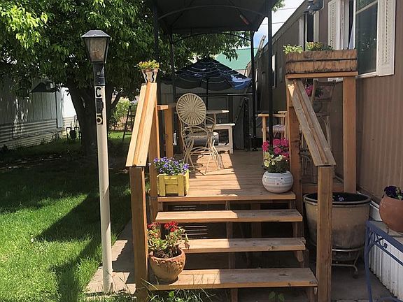 Remodeled 2 Bedrooom/1Bath Mobile in Quiet Senior Mobile Home Park. Features include a French Door Entry with Side Light Glass for a Bright and Cheery Living/ Kitchen Combo. New Hickory Flooring. Enjoy the Entry Deck and Shaded Fenced Yard, with Ditch Shares for Watering. Included is a 10x16 Storage Shed. Buyer must be approved through management. Lot Rent is only $330 monthly which included rent, water, sewer and trash.