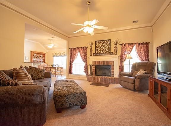 Beautiful home on .6 acres features 3 bedrooms, 2 full baths, office or formal, and 3 car garage. Living area includes wood burning fireplace. Large island kitchen features large breakfast nook, pantry, bar seating, and an abundance of storage. Spacious flex room with wood floors could be office, formal living, or formal dining. Large master suite with tray ceiling includes walk-in closet and private bath with whirlpool tub, double sinks, and separate shower. Safe room in garage. Exterior features covered porch and fenced backyard with, covered patio, gorgeous pergola, and extended patio.