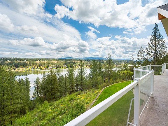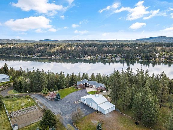 This Waterfront Gated Estate has it all! This home sits up on the bluff with beautiful lake & mountain views. Take a walk or drive down to your own private 123' of low bank Waterfront with its own boat launch, permanent covered, wrap around dock, and a lift. Walk in pvt sandy beach w/plenty of lawn for Rv's, tents etc. Inside the home you are greeted with cathedral ceilings and an open concept. Gourmet kitchen has big island, granite counters, big window over sink w/lake views, hardwood floors. Main fl primary suite, has lg W/I shower with dual heads. Large W/I closet, gas fireplace, and door to deck. A heated 2400 sq/ft shop for the toys. New 30 yr roof, 2 yr old furnace. central vac. Fenced in garden W/back up generator. Great School district and only 15 min to the North side of Spokane, 5 min to the Centennial Trail for hiking & biking. Beautiful Long Lake has 26 miles of boating & recreation with awesome fishing! Rare opportunity to have lakefront on acreage, This is your chance, just in time for summer!